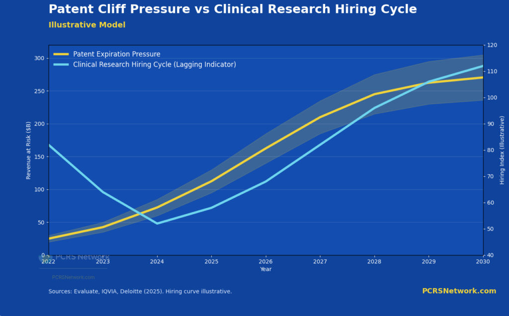 Illustrative model showing how hiring cycles lag underlying clinical development demand, even as patent-driven pressure to replace revenue accelerates.